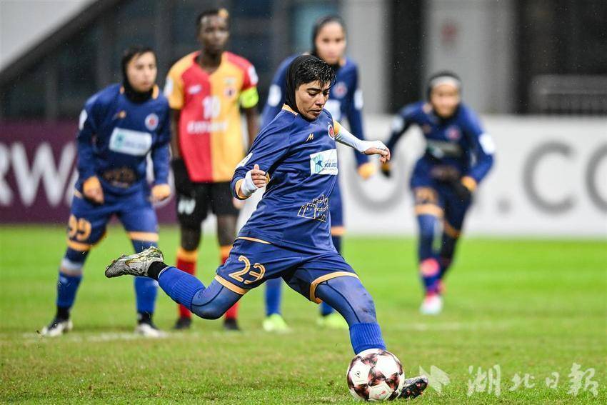 11月17日下昼,巴姆卡通女足(伊朗)队员哈穆迪在比赛中罚射点球。(湖北日报全媒记者 任勇 摄)