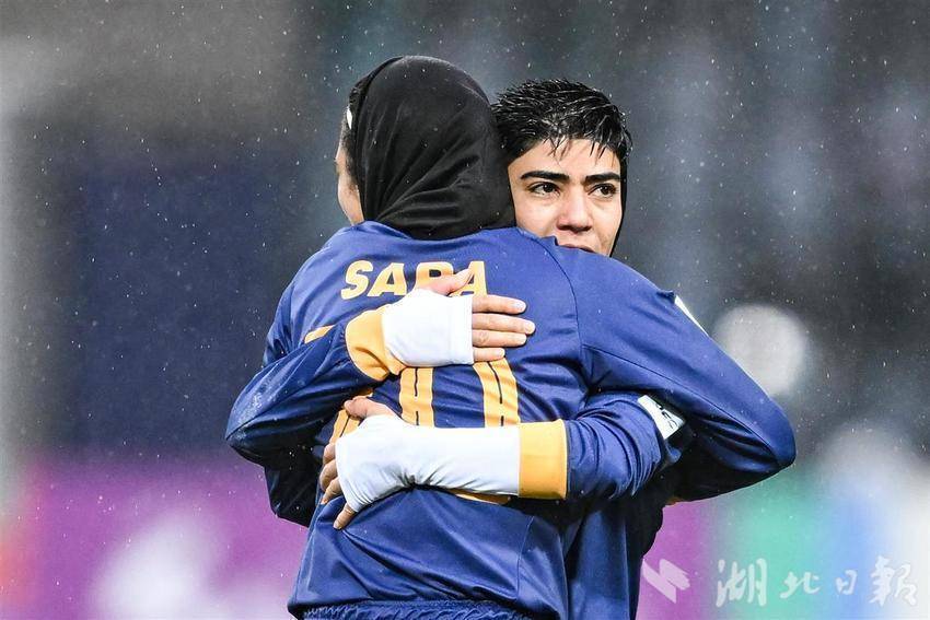 11月17日下昼,巴姆卡通女足(伊朗)队员哈穆迪罚进点球后与队友拥抱庆祝。(湖北日报全媒记者 任勇 摄)